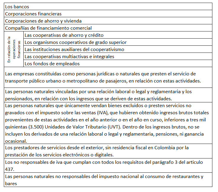 El articulo 616-2, 512-3 y el parágrafo 2 del art 437 del Estatuto Tributario, el articulo 7 de la resolución 000042 de 2020 de la Dian y el articulo 1.6.1.4.3 del Decreto 1625 de 2016 indican quienes no están obligados a facturar: