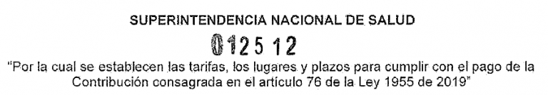 La Superintendencia Nacional de Salud mediante Resolución 012512 del 27 de octubre de 2020 establece los plazos para pagar, lugares y tarifas para cumplir con el pago de la contribución consagrada en el artículo 76 de la Ley 1955 de 2019.