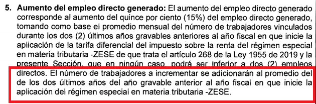 También pone fin a una controversia en cuanto al aumento del 15% del empleo, el cual es uno de los requisitos para acceder a este régimen, ya que la Dian expresó en dos de sus conceptos (uno del 2019 y otro de 2020) que el aumento del 15% debía sumarse al promedio de empleados del último mes del año gravable anterior al año fiscal en que inicie aplicar el régimen ZESE (es decir que al promedio de los empleados del mes de diciembre debía sumarse el 15%, desconociendo que muchas empresas por ser temporada navideña deben contratar más personal y desconociendo el promedio de todo el año), esta interpretación de la Dian también se incorporó en el proyecto de Decreto, interpretación que en nuestro concepto iba en contravía de la Ley.