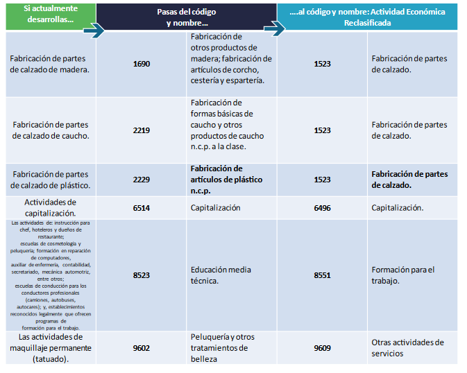 Actividades económicas reclasificadas: A continuación, se describen las actividades que de acuerdo con lo definido en el artículo 5 de la resolución 549 del 8 de mayo de 2020 del DANE, presentan reclasifi-cación en su código y nombre.