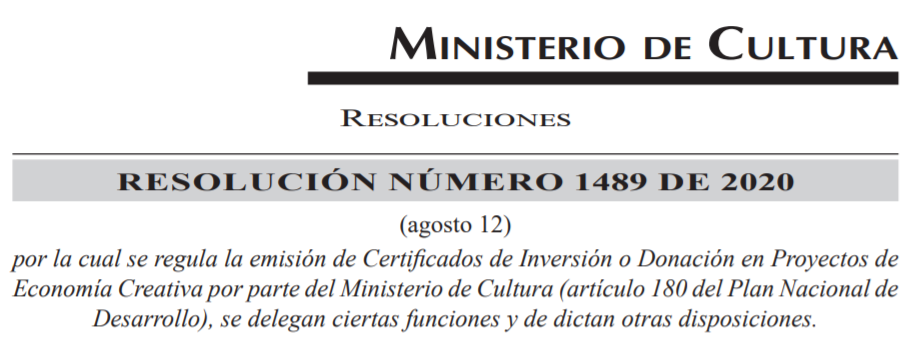El articulo 180 de la Ley 1955 de 2019 (Plan Nacional de desarrollo) Indica que los contribuyentes del impuesto de renta, que realicen inversiones o donaciones en proyectos de economía creativa prodran como beneficio tributario deducir el 165% del valor de la inverisón. La resolución 1489 de agosto 12 de 2020 del ministerio de cultura...Read More