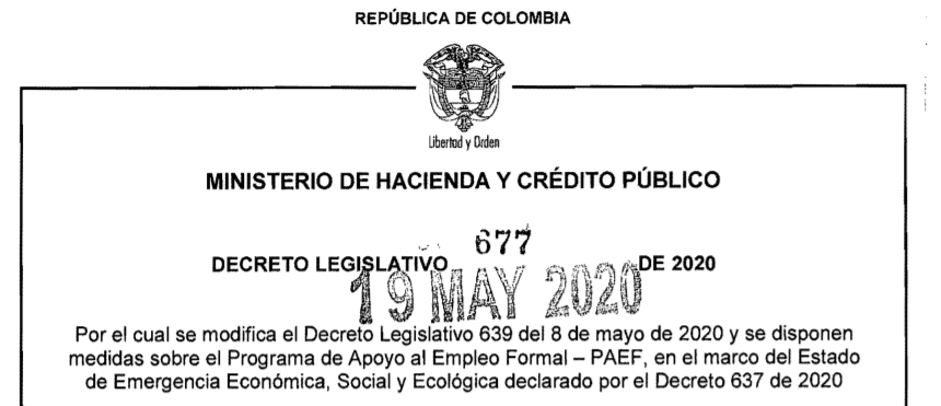 El decreto 677 modifica el Decreto Legislativo 639 mediante el cual se creó el programa para el apoyo de la nómina. Algunas de las modificaciones son: El beneficio aplicará a Personas jurídicas, personas naturales empleadoras, empresas sin ánimo de lucro, consorcios y uniones temporales. Los requisitos para postularse son: Haber sido constituido antes del 1º...Read More